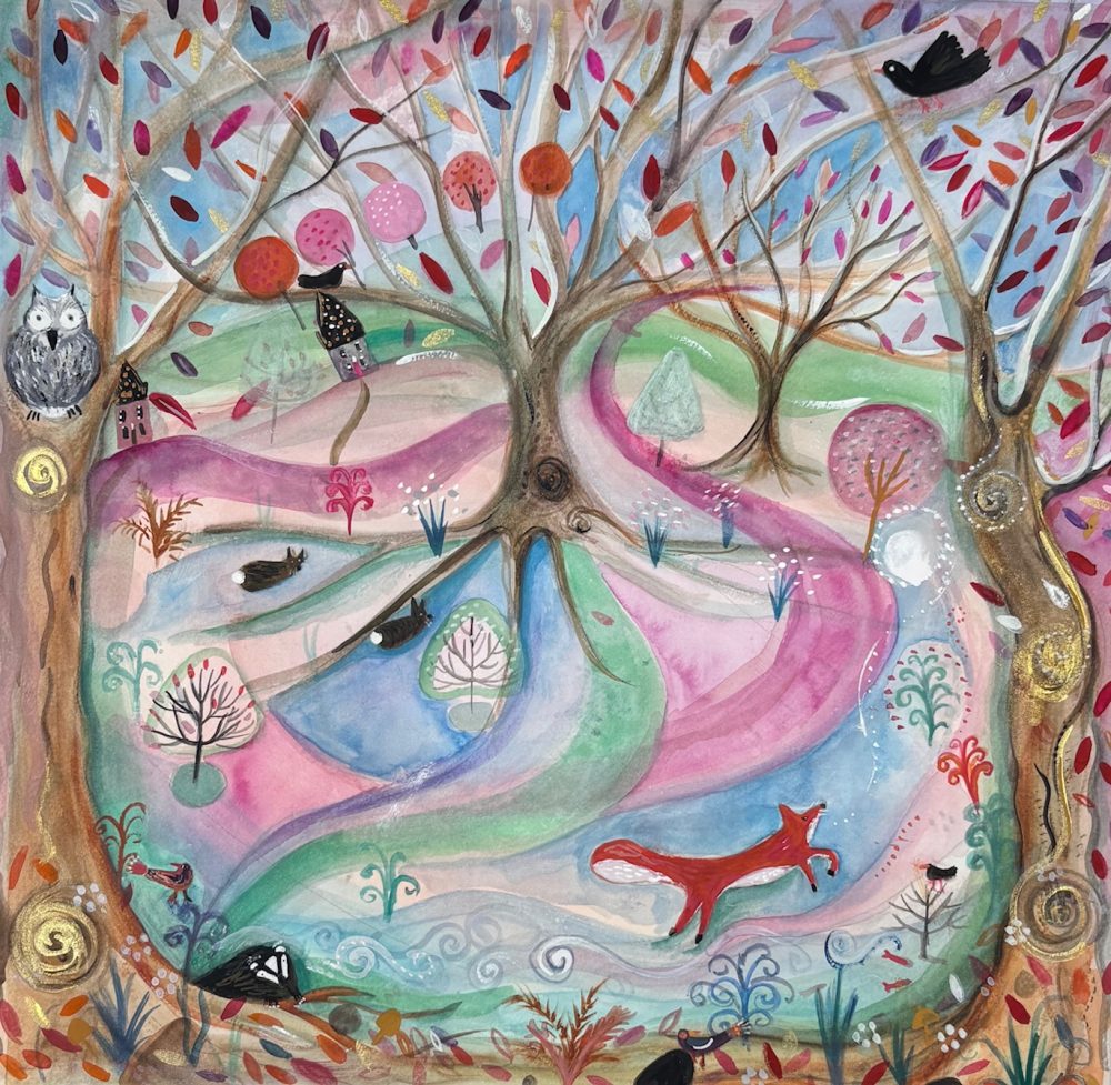This gouache painting of a woodland scene captures recurring themes of wild life that feature in my paintings. I also like to continue to add movement and swirls reflecting and expressing movement from my dance background.