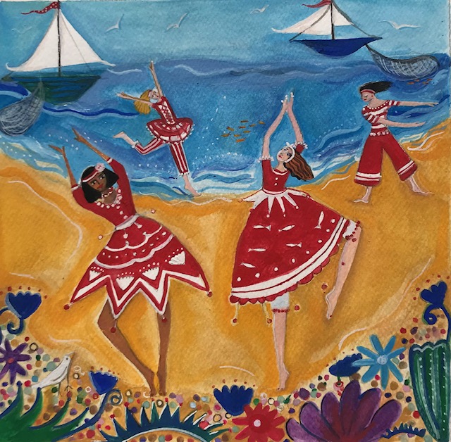 In this painting I have used warm colours and added tropical plants in the foreground to make it decorative and interesting. Again I have added movement not only from the figures but also in the composition; the waves, curves of the sand and bobbing sailing boats.